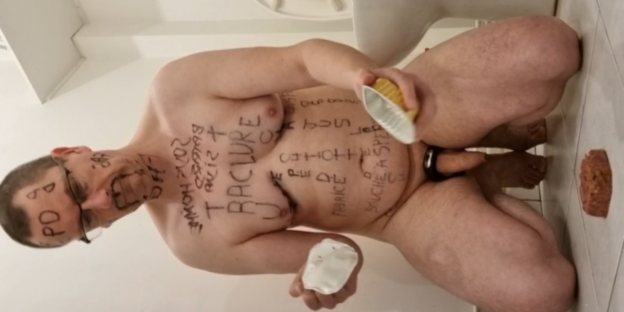 Sous les ordres de @max06fr, je me retrouve à poil dans mes chiottes, couvert d’inscriptions humiliantes au marqueur sur tout le corps :« RACLURE »,…